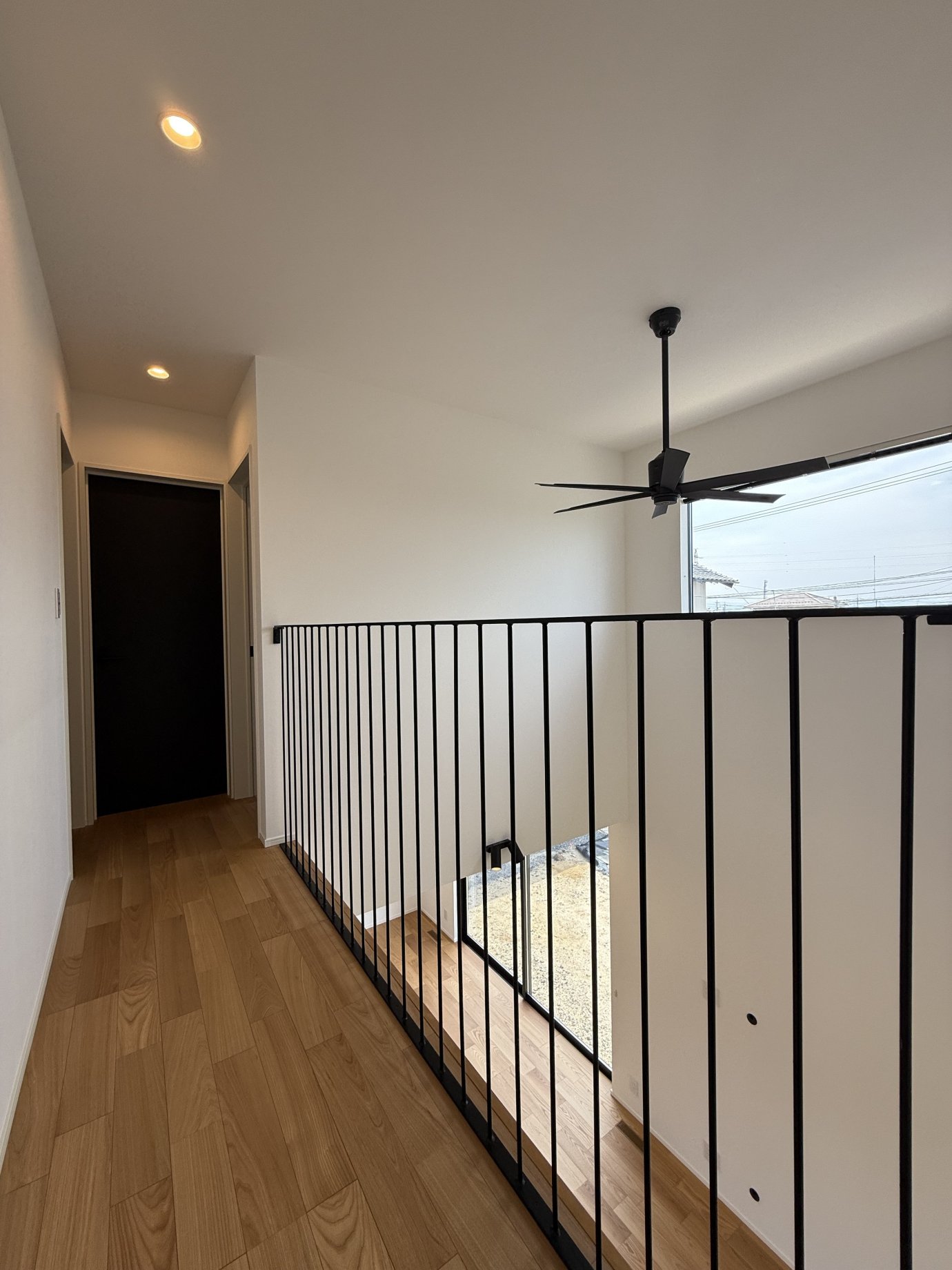 木の温もりを感じるフローリングに黒のアイアン手すりが空間を引き締め