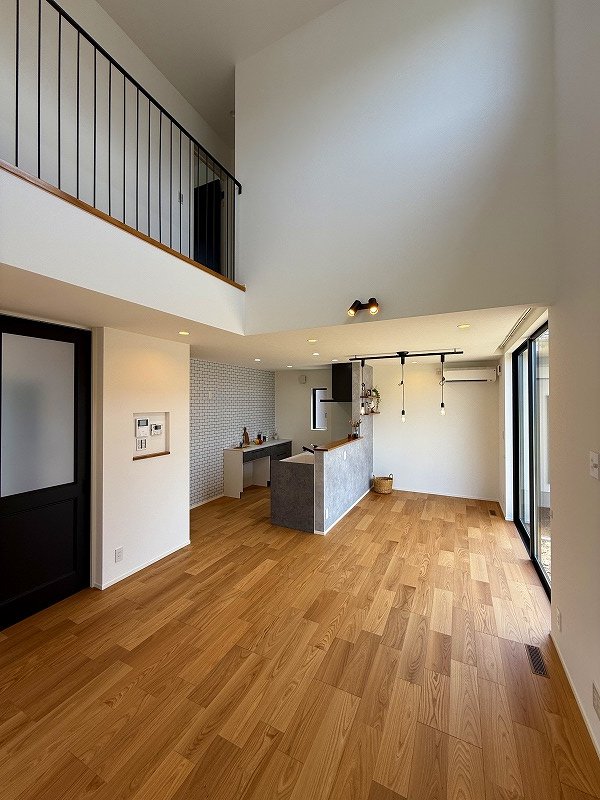 木の温もりを感じるフローリングに黒のアイアン手すりが空間を引き締め