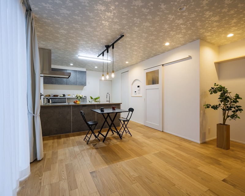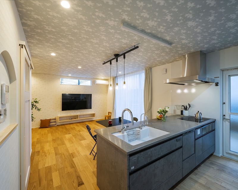 遊び心ある天井クロスが空間にアクセスを加え、グレーのキッチンが上品で落ち着いた印象を与えます。