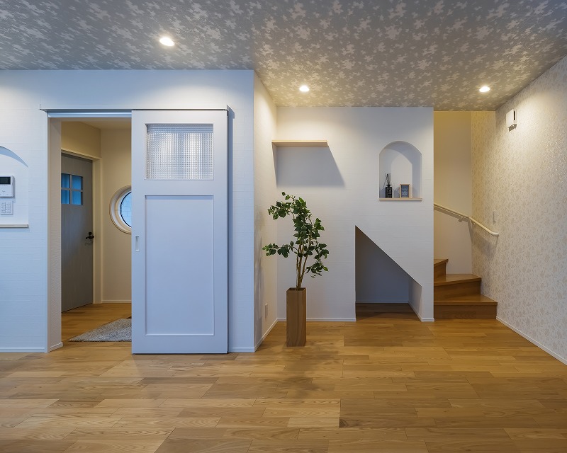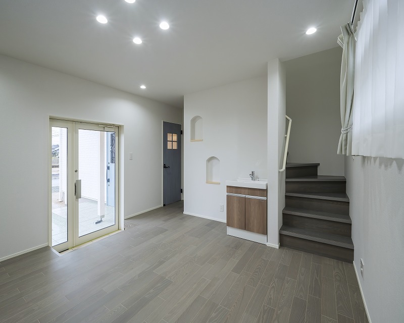階段横の手洗いとニッチが実用性とデザイン性を兼ね備えた心地よい空間を演出します。 -