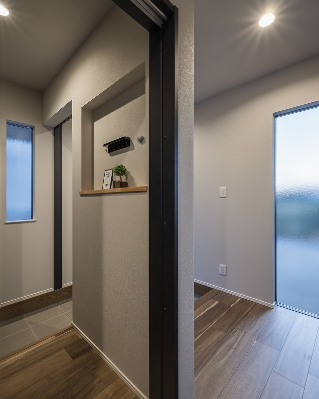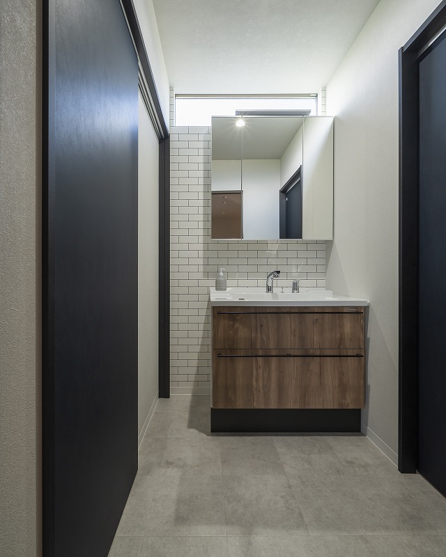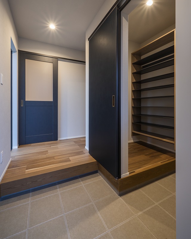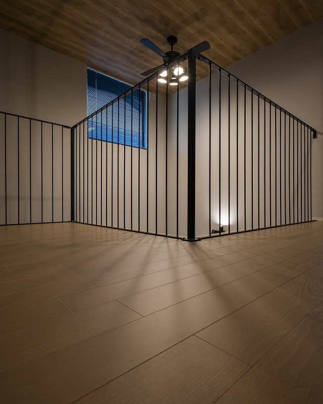 黒のアイアン手すりと建具が空間を引き締めます。