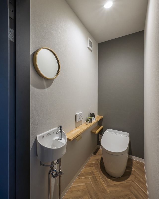 KMEWの外壁を採用したツートンカラーに、木目のアクセントが温もりをプラス。