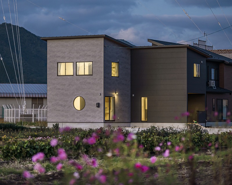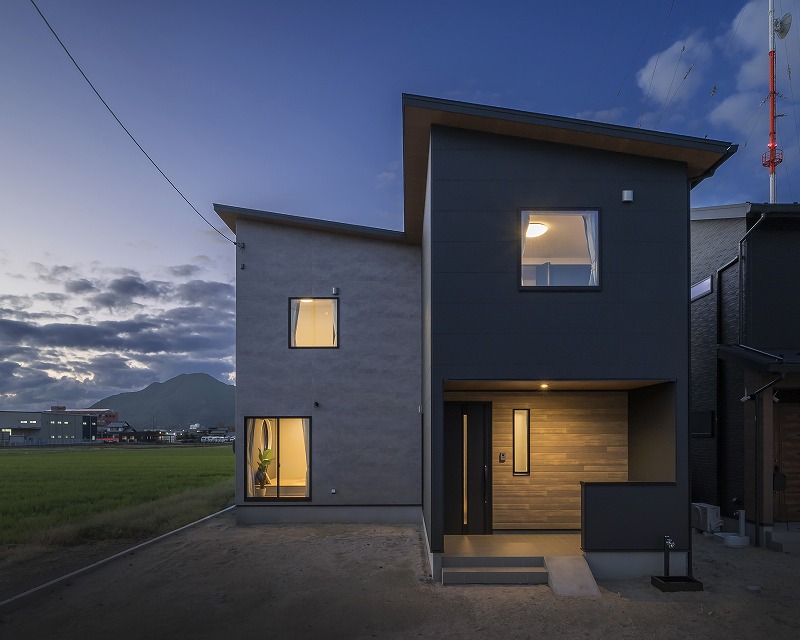 片流れを組み合わせ立体的な外観がシンプルながらも印象的な佇まいを演出します。