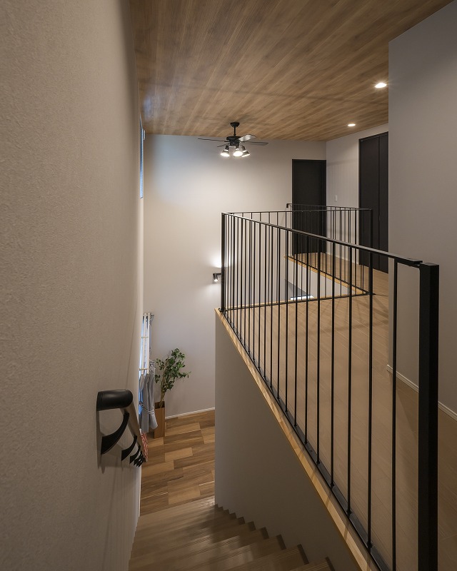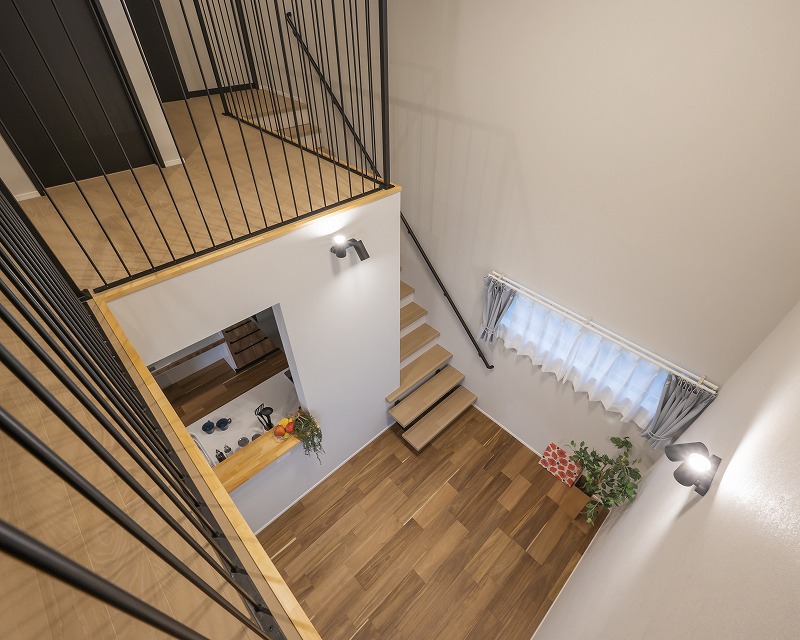 吹き抜けとアイアン手すりが魅せる開放感抜群の階段ホール。