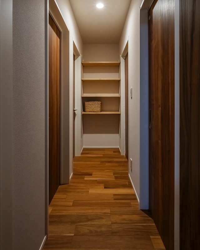 廊下の突き当たりに設けたオープン収納は、動線上で使いやすい計画。造作棚が空間になじみ、使いやすさとすっきりとした見た目を両立しています。