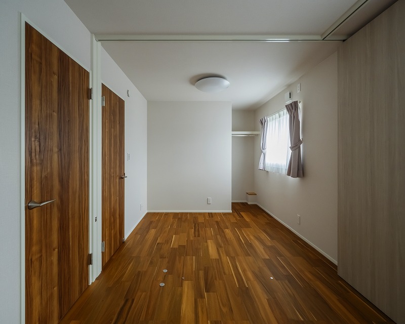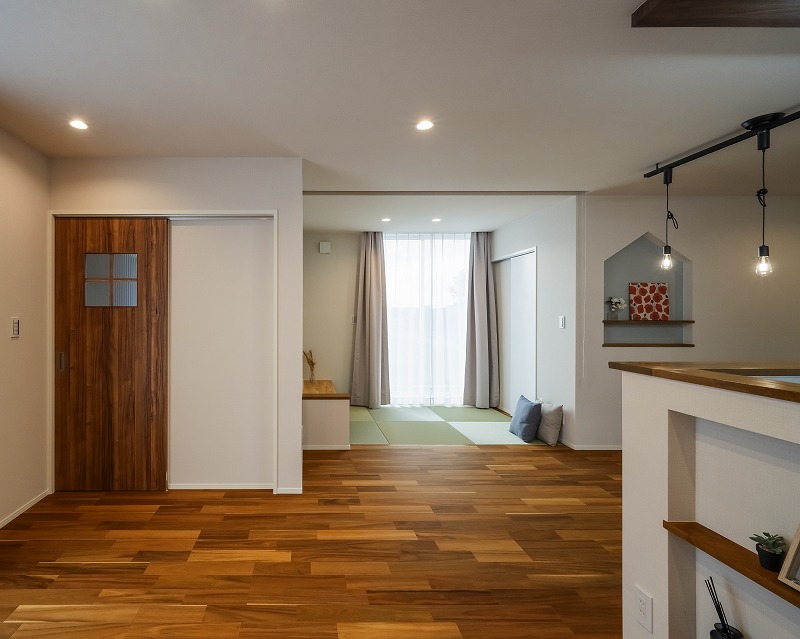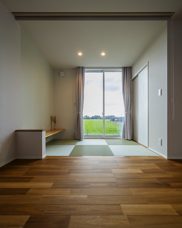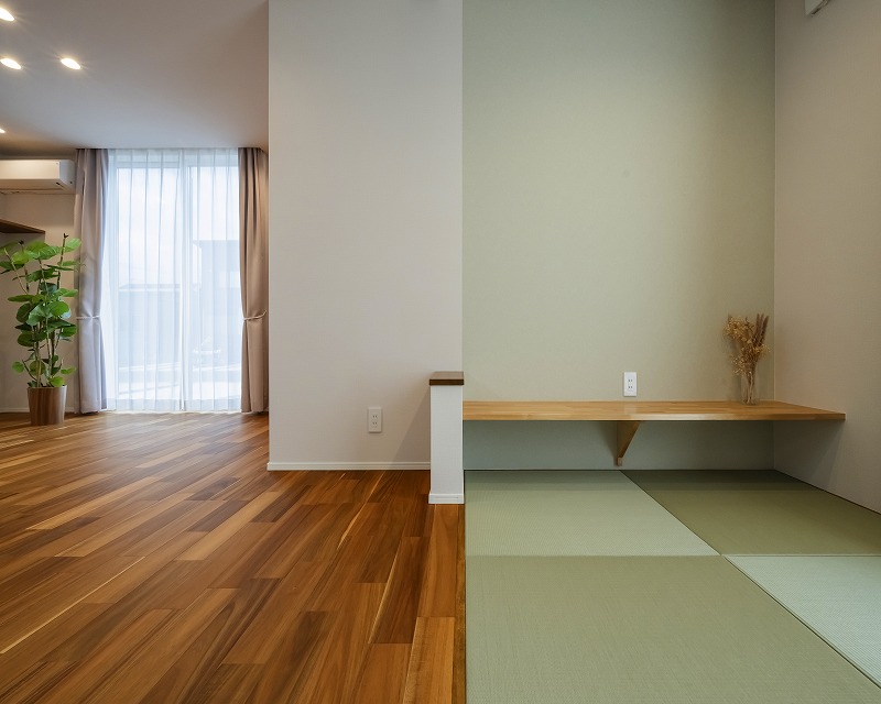 リビングと緩やかにつながる畳スペースは、フラットな床構成で空間に一体感をもたらします。掃き出し窓からの採光で明るく、来客時やくつろぎの場として多用途に対応。お子様が読書や宿題に使える造作デスクも備えました。