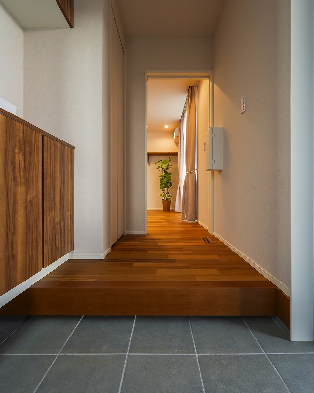木目調の玄関収納とフローリングが統一感を生み、奥まで視線が抜ける動線計画。