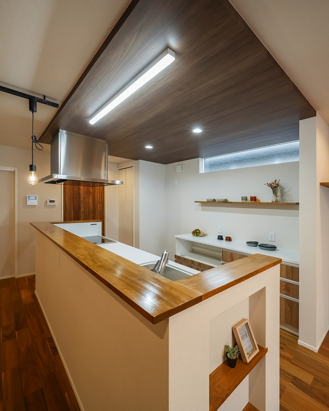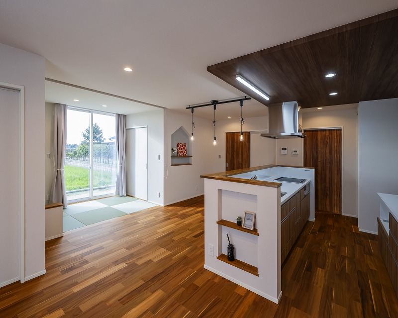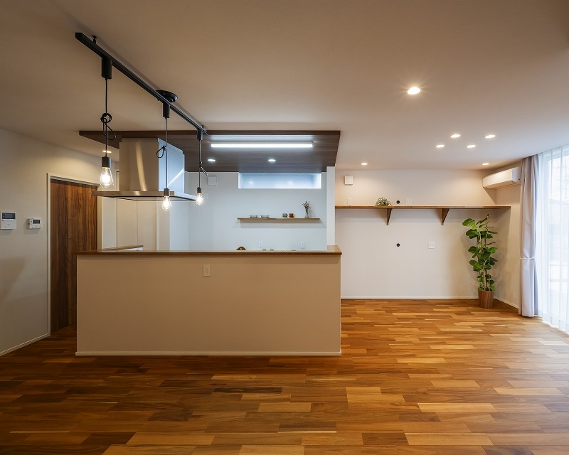 木目のフローリングが美しいLDKは、下がり天井のキッチンが印象的。キッチンのまわりをぐるっと回れる回遊動線で、家事がスムーズに行えます。