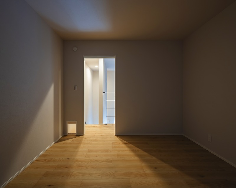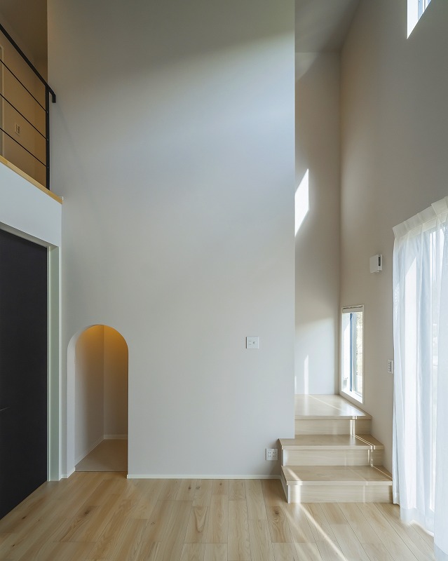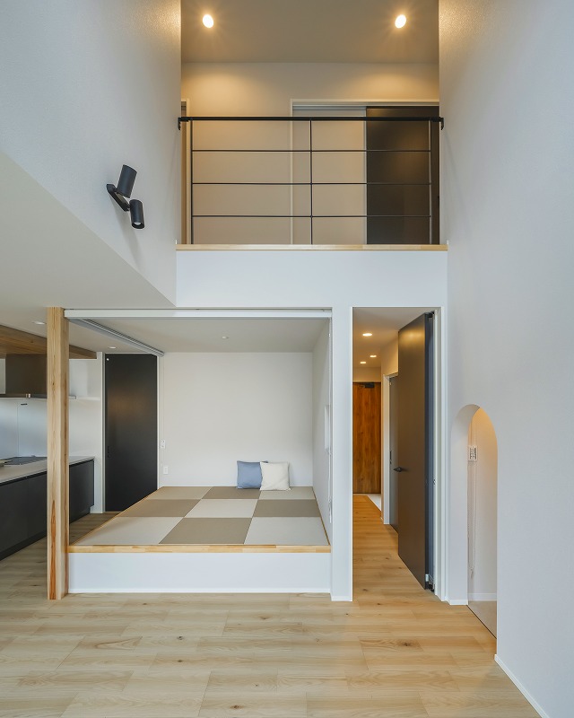 階段下スペースを活かした、アーチ垂れ壁が可愛いペットルーム。小上がり和室は床から40cm高く設計し、ペットが登らないよう配慮。ロールスクリーンで仕切ることで、お子様のお昼寝スペースとしても活躍します。