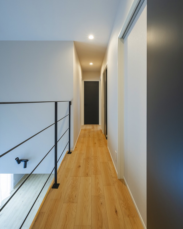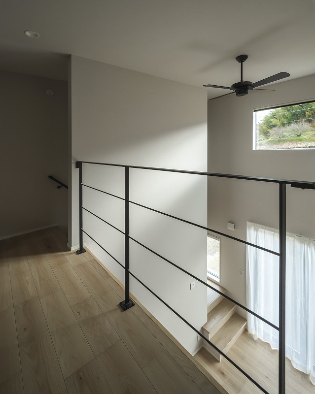 猫ちゃんが日向ぼっこできるよう広めの踊り場を設けた階段。外を眺めたり、のんびり過ごせる猫ちゃんの特等席です。
