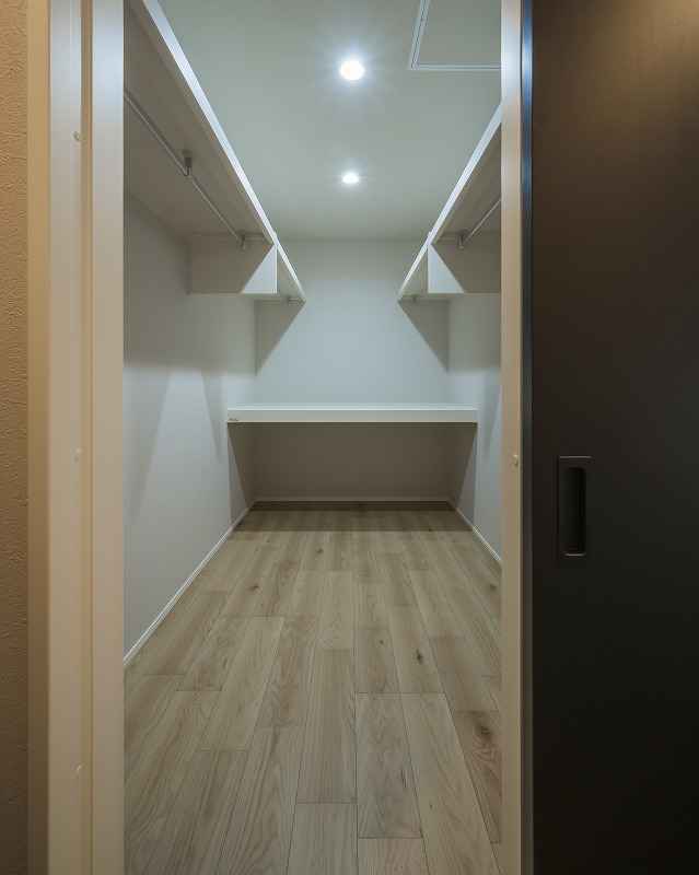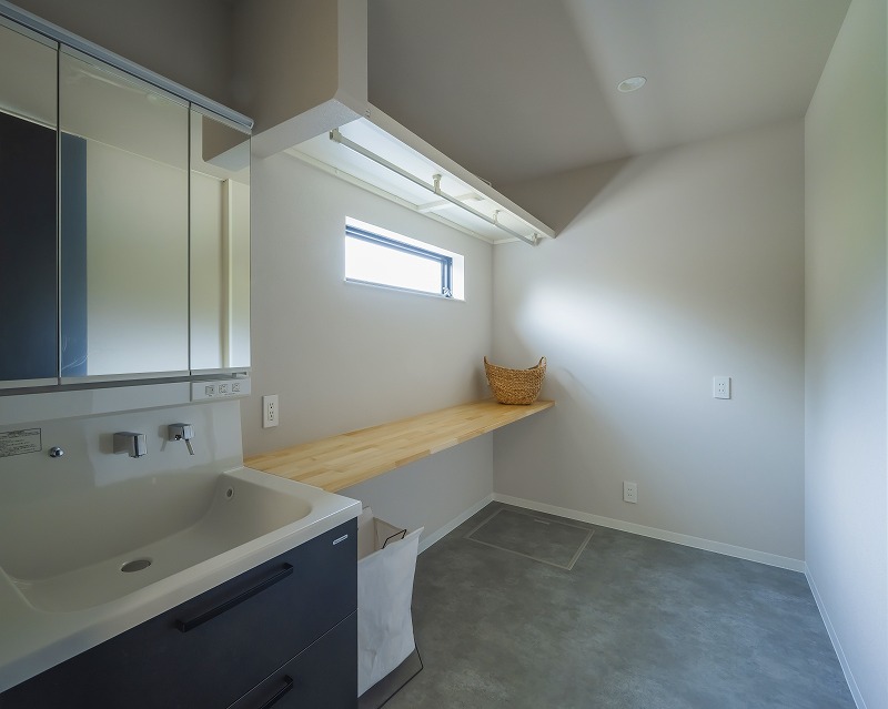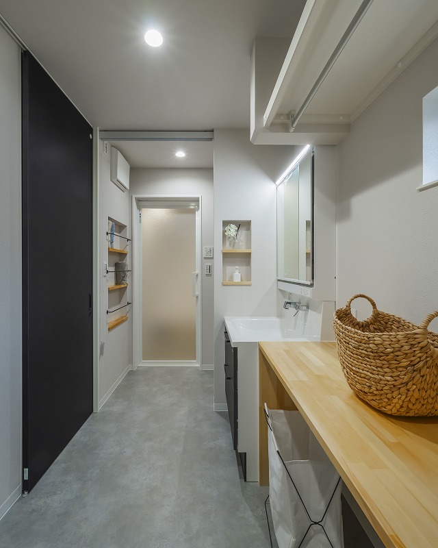 造作カウンターは洗濯物を畳んだり作業がしやすように設計。カウンター下にはタンスが収まるように高さを計画。浴室から届く位置にはタオルニッチを採用。タオルをくるくると巻いて「立てる収納」で見た目もスッキリします。