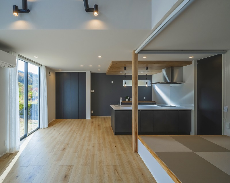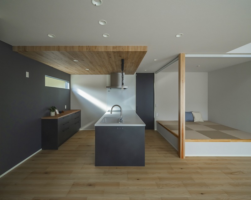 ブラックで統一した対面キッチンを中心に、木目の下がり天井が空間にアクセントをプラス。視線を遮ることなく緩やかに区切り、リビングは吹き抜けの高天井で開放的に。高さの変化でメリハリをつけた心地よいLDKです。